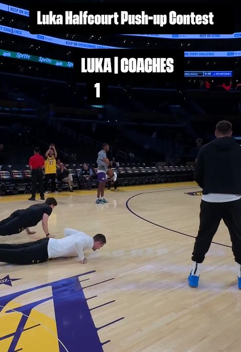 湖人官方社交媒體曬出視頻,東契奇在賽前和助教比拼中場三分投籃。