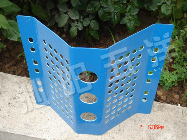 “擋風抑塵板”采用有機玻璃鋼材料經模壓一次成型。理論使用壽命15-20年。使用環境溫度-40℃~80℃。與支架的連接方式采用螺釘和壓板固定擋風抑塵板的具體尺寸及開孔率應根據不同堆場的實際情況進行設計。